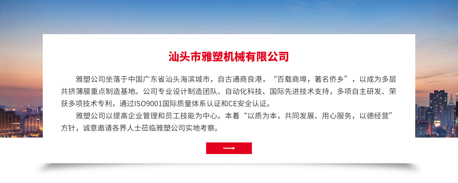 - 雅塑公司坐落于中國(guó)廣東省汕頭海濱城市,自古通商良港,“百載商埠,著名僑鄉(xiāng)”,以成為多層共擠薄膜重點(diǎn)制造基地。